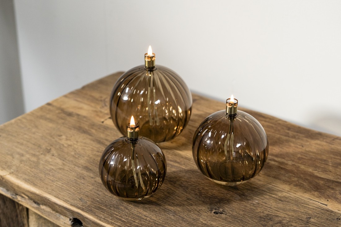 Lămpile moderne cu ulei de parafină sub forma de bilă, de culoare maro, crează un ambient cald și plin de eleganță fără a fumega și fără a li se consuma fitilul.